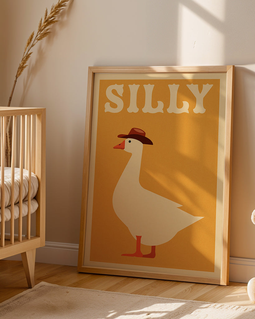 Inspired by a phrase that we say a lot in our house to our two young boys. We've been looking to create some new art for their bedroom and we felt like a goose in a cowboy hat fit the bill (pun intended). We've also added a top hat option for our goose friend too, because we couldn't think of much sillier or cuter.