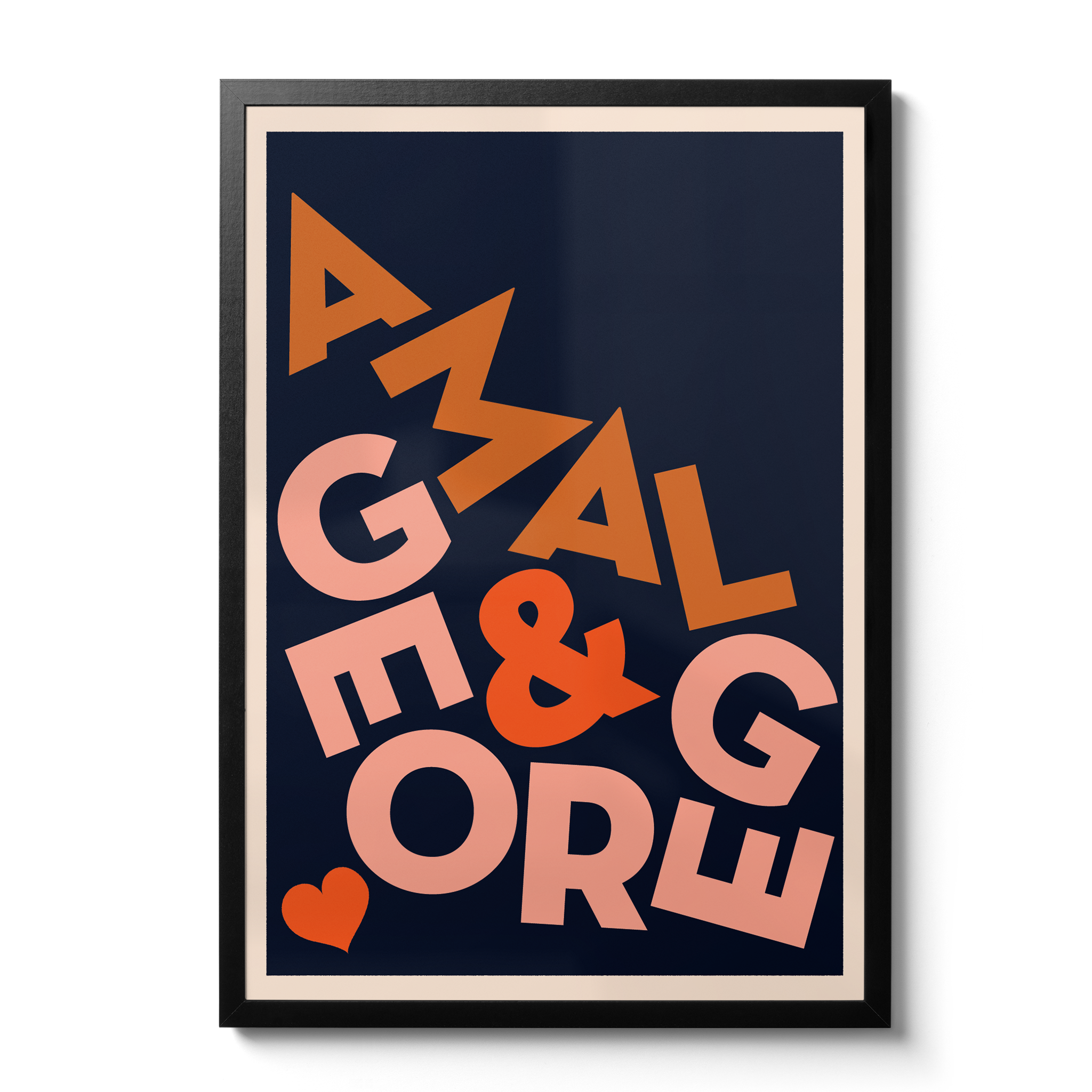 A super bold and super fun way to celebrate you and your other half, or a unique and personal gift for your favourite couples. Each custom print is designed from scratch to fit in your two chosen names in our cute tumble type design.